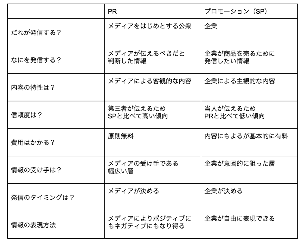 ここまで前提知識としてそれぞれの意味を解説いたしました。PRとプロモーションの意味を理解したところで次に両者の違いを解説いたします。PRとSales Promotion(以下、プロモーション)の違いは大きく分けて2つあります。