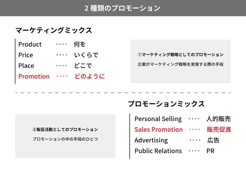 実は現在プロモーションと呼ばれているものには2種類あります。①マーケティング戦略という概念のなかでのプロモーションと、更にそのプロモーションのなかで②販促活動として捉えられているプロモーションです。わかりやすくひとつずつ紐解いて解説します。