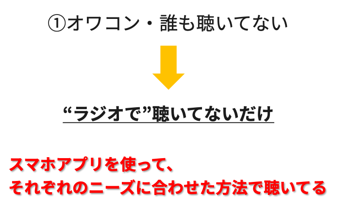 例えば、ラジオはオワコンで誰も聞いていないと言われていますが、それは「ラジオ」で聴いていないだけなんです。radikoなど配信方法が多様化しているので、スマホアプリを使ってそれぞれのニーズに合わせて皆さん聴いているんです。そのスマホアプリが増えただけで、相対的な人数でいくと、ラジオを聞いている人口は増えていると思います。実際、コロナ禍でラジオのリスナー数は伸びています。これはニュースにもなっているので、皆さんもよくご存知かもしれませんが、大体前年度比で1.5倍とかなり増えています。