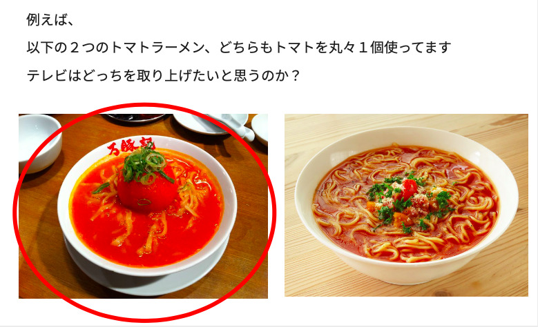 右ももちろんトマトを丸々一個使って美味しいかもしれませんが、この写真だとただ辛いラーメンにも見えますよね。なので、映像でいかにインパクトを残せるかというのがテレビの特徴なので、見せ方は特に重要視しています。広報担当の方はその部分を考えておくと取り上げ取り上げさせやすいものになってくるのではないかと思います。