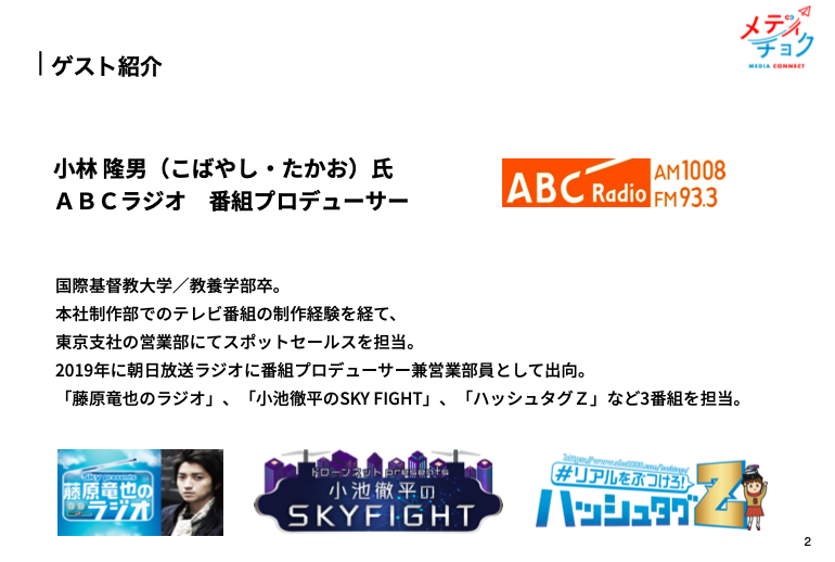 メディチョクが月に1回開催している「メディアセミナー」。今回のテーマは、「ラジオ出演の方法」です。朝日放送ラジオ番組プロデューサーの小林隆男(こばやし・たかお)氏をゲストに迎え、ラジオ出演の方法と番組制作の裏側をお聞きしました。